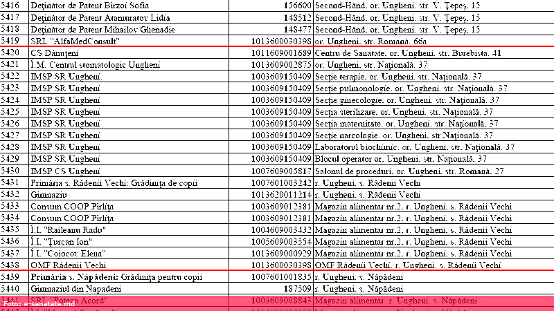 În timp ce consilierii spun că nu au idee despre ce se întâmplă, o instituție de stat este trecută la balanța privaților. Pare greu de crezut că nimeni nu știa despre acest lucru. Cert este că acum Oficiul Medicilor din Rădenii Vechi și AlfaMed Consult au același cod fiscal. Mai bine zis, acum la Camera Înregistrării de Stat este identificată o singură companie, după codul fiscal care aparținea OS Rădenii-Vechi. În Registrul de Stat al Controalelor cele două instituții erau trecute după același cod fiscal – 1013600030398. Informația este confirmată și din alt document al Serviciului de Supraveghere de Stat a Sănătății Publice.