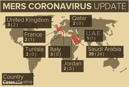 Cazuri de infectare cu MERS s-au înregistrat până în prezent în Iordania, Qatar, Emiratele Arabe Unite, Marea Britanie, Franța, Germania, Italia și Tunisia. Majoritatea acestora au, însă, o legătură directă cu Arabia Saudită.