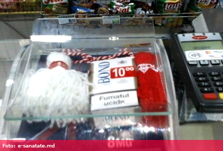 În această lună industria tutunului a găsit o metodă inedită de a-și promova produsele din tutun. Folosesc Mărțișorul pentru publicitate la țigări. Cel puțin așa se practică într-un magazin din Chișinău de pe str. Bănulescu-Bodoni, intersecție cu str. Columna. La intrarea în magazin, primul lucru care îți atrage atenția este cutia mare de sticlă în care se află un Mărțișor enorm, iar în mijloc un pachet de țigări. Frumos ornamentată, cutia este amplasată exact pe masa vânzătoarei, fiind utilizată drept suport pentru bani. Astfel, producătorii de tutun încearcă să promoveze și ieftinirea țigărilor. Pe pachetul este scris cu cifre mari prețul țigărilor.