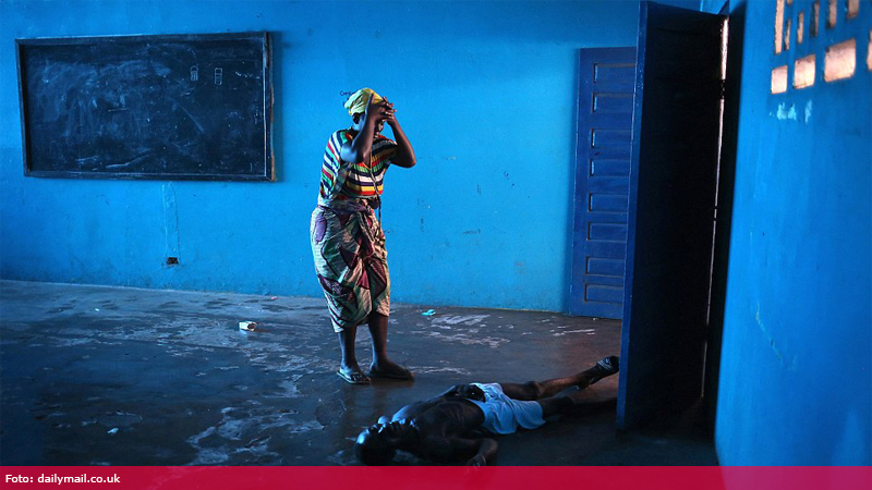 Omu Fahnbulleh stă deasupra soțului său Ibrahim, care a căzut și a murit într-o clasă din școală care era folosită pentru bolnavii de Ebola, în Liberia, anul trecut.