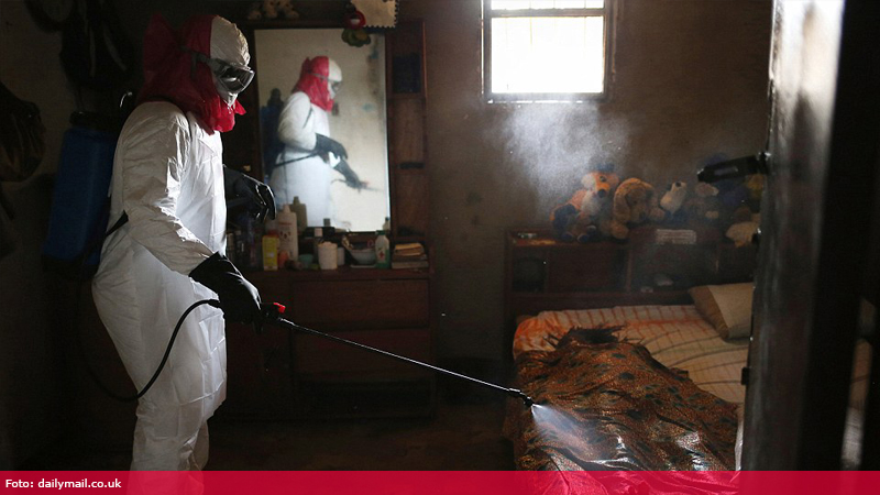 O echipă a Crucii Roșii din Liberia dezinfectează patul, unde se află o femeie care după părerea medicilor a murit de Ebola.