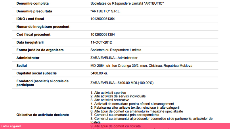 Acestea însă nu sunt singurele proprietăți ale lui Zara. O anchetă realizată de reporterii Centrului de Investigații Jurnalistice a scos la iveală faptul că funcționarul nu a indicat în declaraţia cu privire la venituri şi proprietăţi firma soţiei sale. Conform datelor de la Camera Înregistrării de Stat, soţia actualului director al Agenției Medicamentului și Dispozitivelor Medicale, fost șef la „Gări şi Staţii Auto”, Evelina Zara, este fondatoare şi administratoare la „Artbutic” SRL. Firma activează sub denumirea de „Vivi Art Butic” şi se ocupă, printre altele, cu organizarea evenimentelor. Funcționarul nu a declarat firma soției nici în declarația cu privire la venituri și proprietate pentru anul 2014.