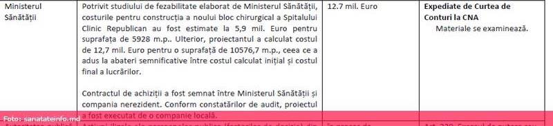 „Potrivit studiului de fezabilitate elaborat de Ministerul Sănătății, costurile pentru construcția noului bloc chirurgical al Spitalului Clinic Republican au fost estimate la 5,9 milioane de euro pentru suprafața de 5.928 metri patrați. Ulterior, proiectantul a calculat costul de 12,7 milioane de euro pentru o suprafață de 10.576,7 metri pătrați, ceea ce a dus la abateri semnificative între costul calculat inițial și cel final al lucrărilor”, scrie în raportul publicat de CNA.