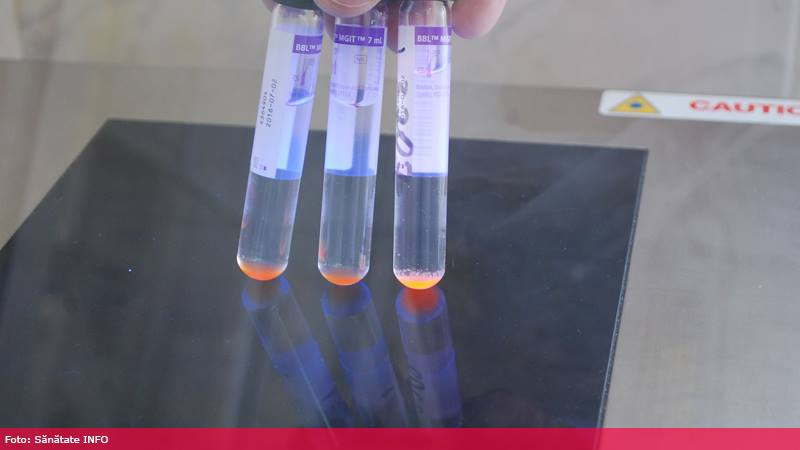 Într-o altă cameră o găsim pe Eugenia Rusu, felcer-laborant. Ea aranja câteva eprubete cu colonii de tuberculoză, testate în mediul solid. E vorba de mai multe eprubete, care conțin o substanță de culoare verzuie, cu ajutorul căreia putem vedea cum arată tuberculoza. Vedem niște particule mici de culoare albă sau gălbuie. „Aici sunt micobacterii vii. Așa arată după ce sunt însămânțate și puse la cald. Materialele date se examinează timp de două luni. Ulterior, se verifică sensibilitatea bacteriei la diferite medicamente”, explică Eugenia Rusu.