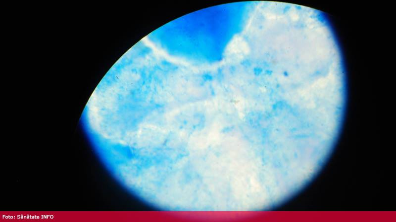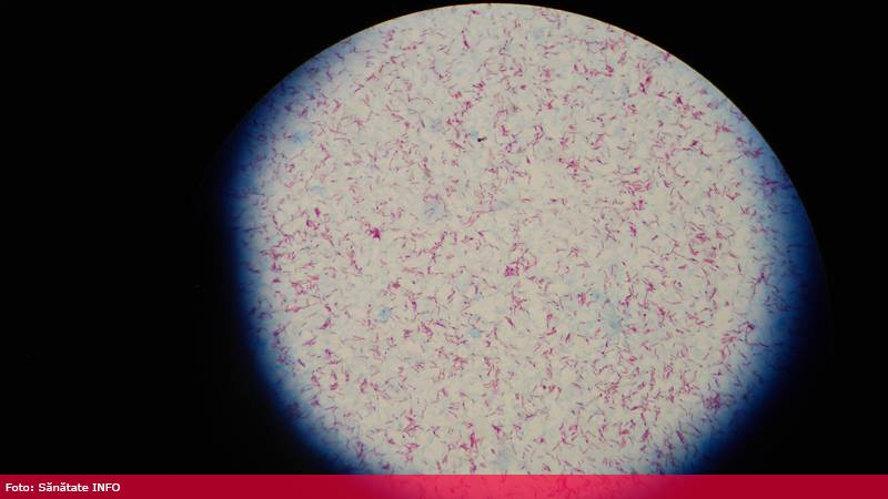 Următorul pas este examenul microscopic. Sergiu Eftodii este medic laborant. Toată ziua el muncește într-o încăpere întunecată, amenajată special pentru examinarea frotiurilor. El analizează diverse probe pentru a vedea care dintre ele conțin bacilul tuberculos. Mi-a permis și mie să privesc la microscop cum arată bacteria. Am văzut și probe care din contra arată că omul nu are tuberculoză. De exemplu, bacilul tuberculos se vede sub formă de bețișoare de diverse forme, de culoare roșie sau fucsia, amplasate pe fundal de culoare verzui deschis. Pare a fi o serie de microorganisme, care-ți captivează privirea. Însă, când testul este negativ, putem vedea doar câteva pete de culoare albastru intens. „Frotiurile date sunt păstrate timp de jumătate de an”, spune medicul laborant Eftodii.