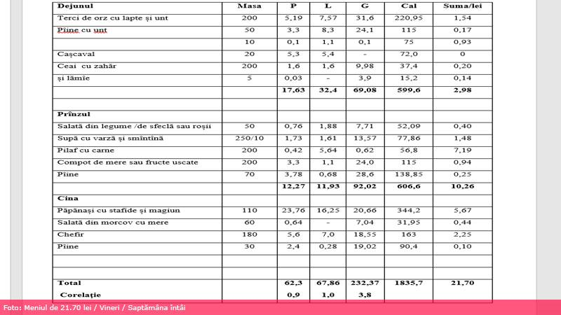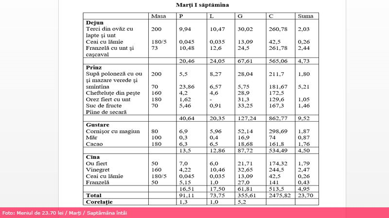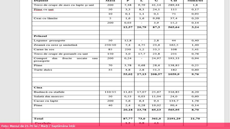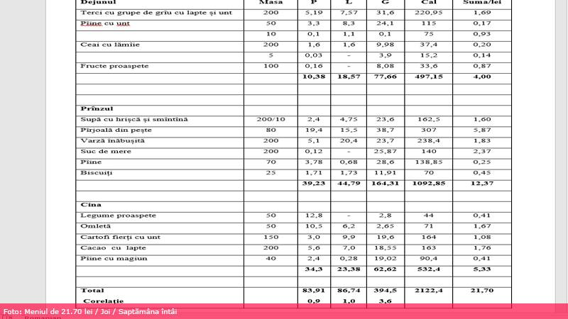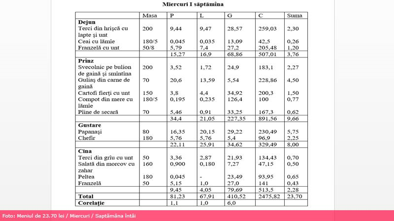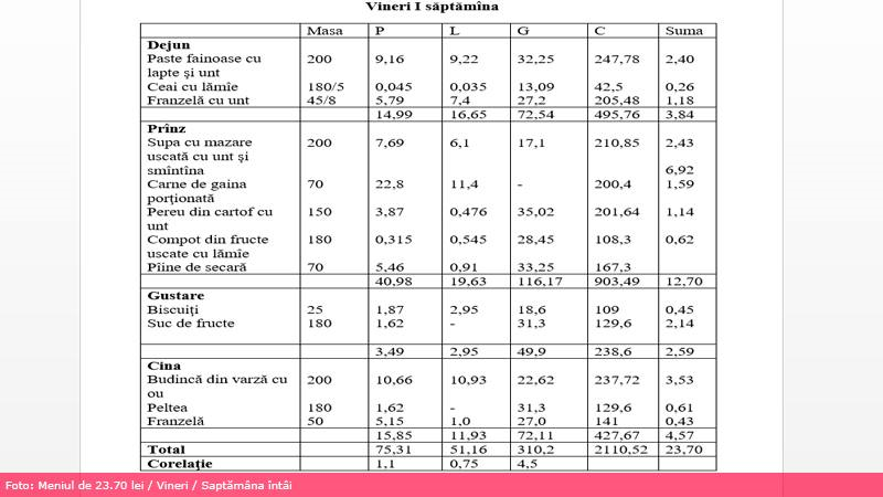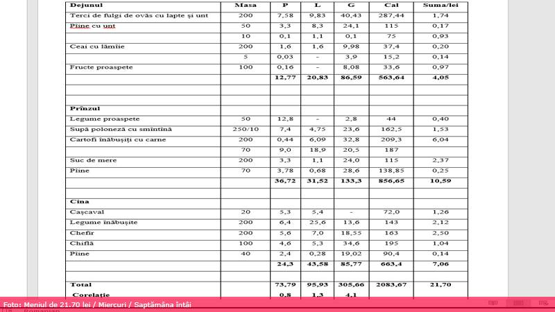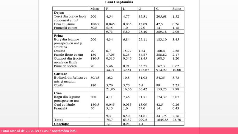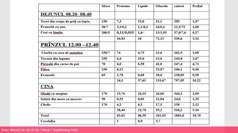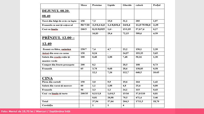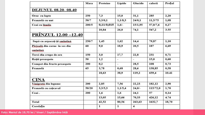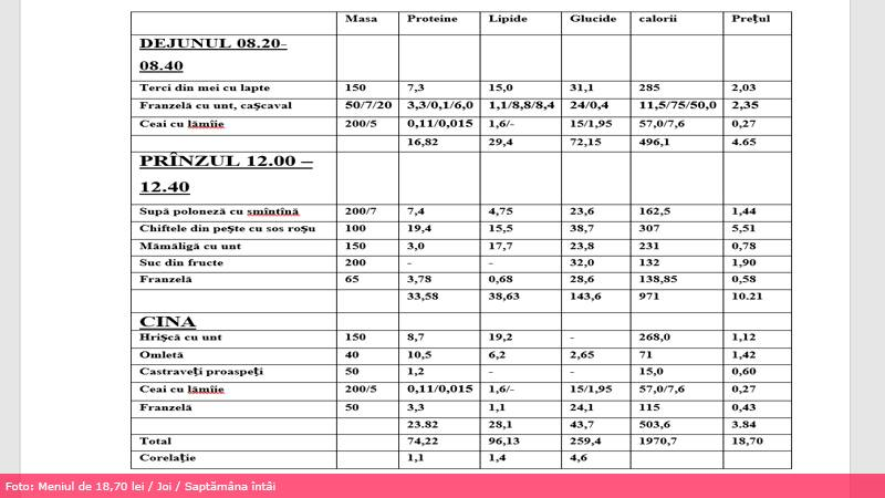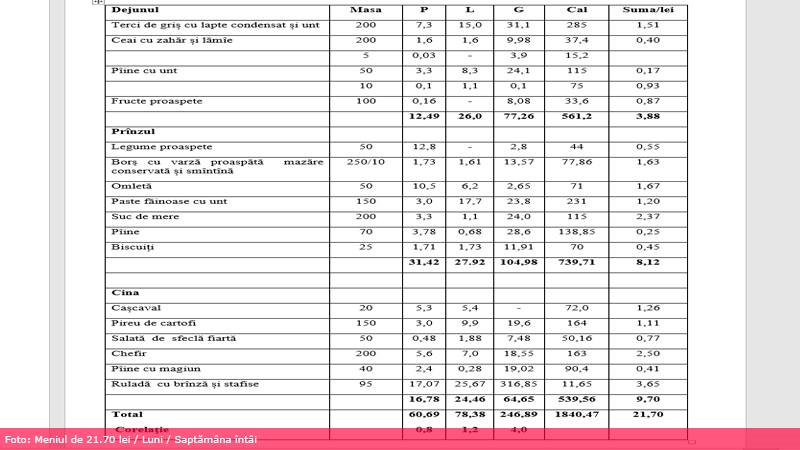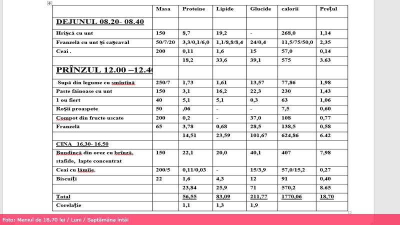 Astfel, specialiștii au elaborat patru modele de meniuri care urmează să acopere o perioadă de două săptămâni. Responsabilii au ținut cont de banii pe care îi oferă statul pentru alimentația copiilor, dar și de posibilitățile părinților de a contribui la îmbunătățirea lor.