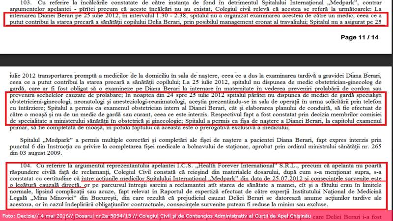 În explicația judecătorilor de la Curtea de Apel Chișinău se spune că un lucru grav admis de către Medpark este faptul că acesta a permis multiple corectări și completări ale fișei de naștere a pacientei Diana Berari, fapt expres interzis prin punctul 6 din Instrucția cu privire la completarea fișei medicale a bolnavului de staționar, aprobat prin ordinul nr. 265 din 2009, care prevede că se interzic orice corecții și modificări.