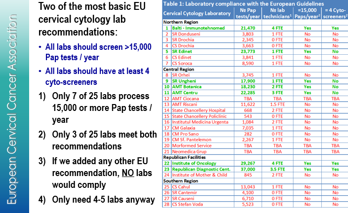Studiul îi aparține lui Philip Davies, Director General ai Asociației Europene pentru prevenirea cancerului de col uterin din Belgia și s-a axat pe analiza testelor Pap realizate pe parcursul anului trecut, pe numărul angajaților, cunoștințele lor și dotările din laboratoare. Așadar, în Moldova 28 de laboratoare realizează teste pentru depistarea cancerului de col uterin. În cadrul studiului au participat 25 de laboratoare, oficial fiind raportate peste 236.500 de teste, suficient încât să acopere peste 72 la sută din grupul-țintă.