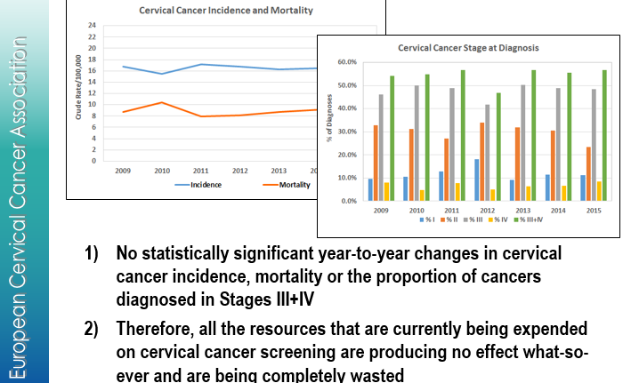 „Nu există modificări semnificative în statistica din ultimii ani în ceea ce privește incidența cancerului de col uterin, mortalitatea sau proporția cazurilor de cancer diagnosticate în stadiile III + IV. Prin urmare, toate resursele care sunt în prezent alocate pentru screening sunt consumate fără să producă vreun efect, fiind complet irosite”, explică Davies.