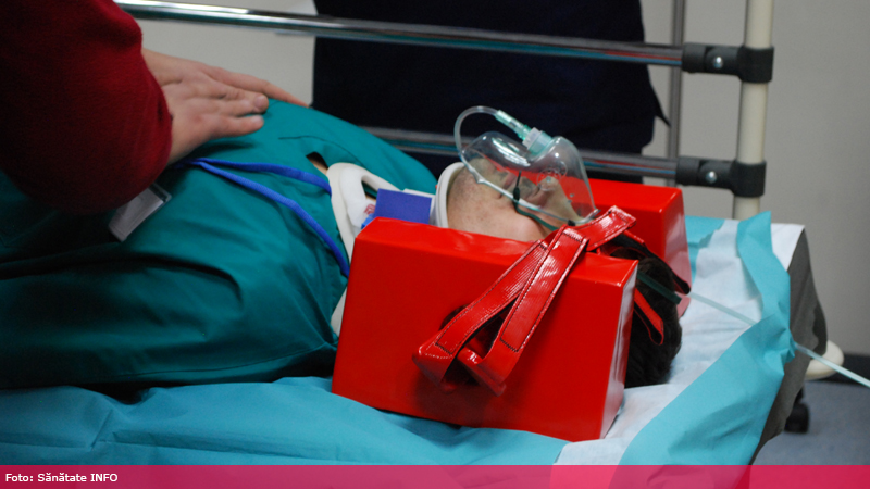 O altă sală de intervenție. Un alt pacient care are nevoie de ajutorul urgent al medicilor. De data aceasta, instruirea a avut loc pe un pacient standardizat, adică pe un om care joacă rolul unui bolnav, conform unor scenariu prestabilit. În acest caz este vorba despre o persoană ce a condus o motocicletă în stare de ebrietate. În consecință, s-a produs un accident, iar pacientul s-a ales cu un traumatism cranio-cerebral. Medicii s-au concentrat să gestioneze corect cazul.