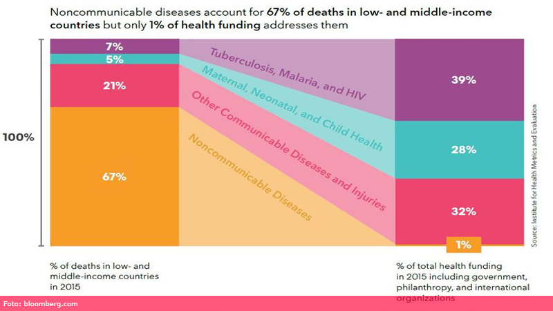 Această problemă este deosebit de acută în ţările cu venituri mici şi medii. După cum se arată în diagrama de mai jos, doar un procent din fondurile globale pentru sănătate vizează prevenirea bolilor netransmisibile din aceste ţări, chiar dacă ele constituie 67% din decese.