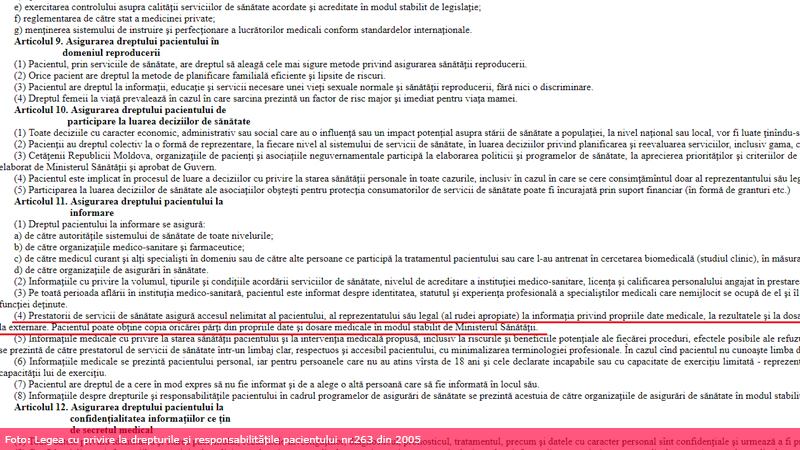 Totodată, potrivit Legii privind drepturile și responsabilitățile pacientului, mama avea tot dreptul să ceară fișa medicală a copilului pentru a se informa sau face poze, inclusiv să ceară și o copie a acesteia.