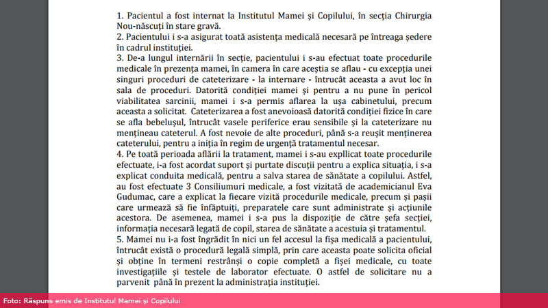 Am încercat să vorbim cu specialiștii din secția Chirurgia nou-născuților de la IMC ca să ne explice de ce au limitat accesul mamei în sala de proceduri și la datele din fișa medicală a copilului. De asemenea, am vrut să știm dacă această regulă se aplică în cazul tuturor părinților sau doar în acest caz. În răspunsul venit abia astăzi de la administrația Institutului, aceasta nu ar fi admis nicio încălcare privind drepturile pacientului și a precizat că nu ar fi limitat accesul mamei în sala de proceduri și nici la fișa medicală.