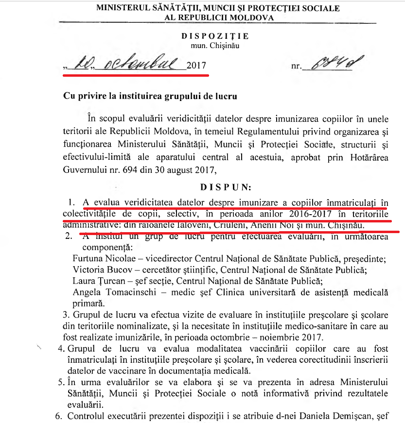 Ministerul Sănătății și Centrul Național de Sănătate Publică au fost informați de specialiștii din medicina preventivă din raionul Strășeni despre presupuse cazuri de falsificare a datelor privind imunizarea copiilor. Aliona Serbulenco, fost medic șef sanitar de stat și viceministru ne-a comunicat că este în concediu acum și că nu cunoaște informații de ultimă oră. Ea a semnat un ordin prin care a fost instituită o comisie care să analizeze ce s-a întâmplat.