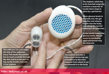 Dispozitivul poate fi implantat în abdomen, cu cantitatea necesară de insulină. „Proviziile” de insulină pot fi adăugate la fiecare două săptămâni, folosind un tub care trece în afară prin piele. Dispozitivul, de mărimea unui de ceas de mână, a fost creat de oamenii de știință de la Universitatea De Montfort, din Leicester.