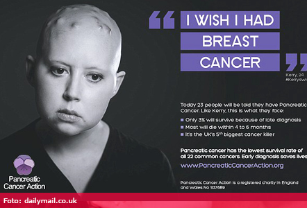 „Aș fi vrut să am cancer la sân”. Așa începe un spot de sensibilizare și conștientizare a gravității cancerului pancreatic, care a scandalizat societatea britanică. Prin acest mesaj dur, asociația bolnavilor a vrut să atragă atenția asupra faptului că șansa de a supraviețui a unui bolnav de cancer pancreatic este cu mult mai mică decât a unui bolnav de cancer la sân și că decesul survine doar în câteva luni.