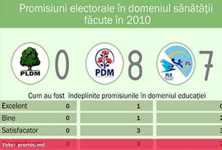 Astfel, într-o analiză publicată pe platforma promis.md, un produs al asociației ADEPT, sunt relatate promisiunile electorale, dar și realizările partidelor care s-au aflat la guvernare în ultimii patru ani. Astfel, cu cele mai multe, dar și nu tocmai realiste promisiuni s-a lansat Partidul Democrat. Încercând să convingă că merită voturi, membrii acestei formațiuni au promis polițe mai ieftine pentru tinerii de până la 30 de ani, majorări esențiale de salarii pentru lucrătorii medicali, dar și modernizarea infrastructurii instituțiilor medicale. Acestea așa și au rămas la capitolul restanțe. Totuși, una dintre realizările acestui partid, atrag atenția autorii analizei, este asigurarea facilităților pentru unele grupuri de moldoveni și aici vorbim despre asigurarea cu poliță medicală a celor care au în grija lor o persoană cu dizabilități, precum și asigurarea serviciilor medicale gratuite în baza poliței pentru mamele care îngrijesc copii de până la trei ani și care nu sunt încadrate în câmpul muncii.