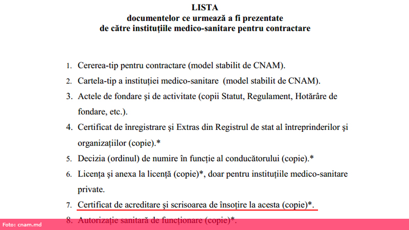 Astfel, în afară de certificatul de acreditare, în ordin se indică că mai este nevoie de cererea de contractare, după un model stabilit de CNAM, cartela-tip a instituției, extrasul din Registrul de Stat al întreprinderilor și organizațiilor, ordinul de numire în funcție a conducătorului instituției, licența și anexa licenței, certificatul de acreditare și scrisoare de însoțire, autorizația sanitară de funcționare, certificatul de deschidere a contului bancar, o adeverință eliberată de Biroul Național de Statistică privind certificatul de atribuire a codului statistic și, desigur, oferta.