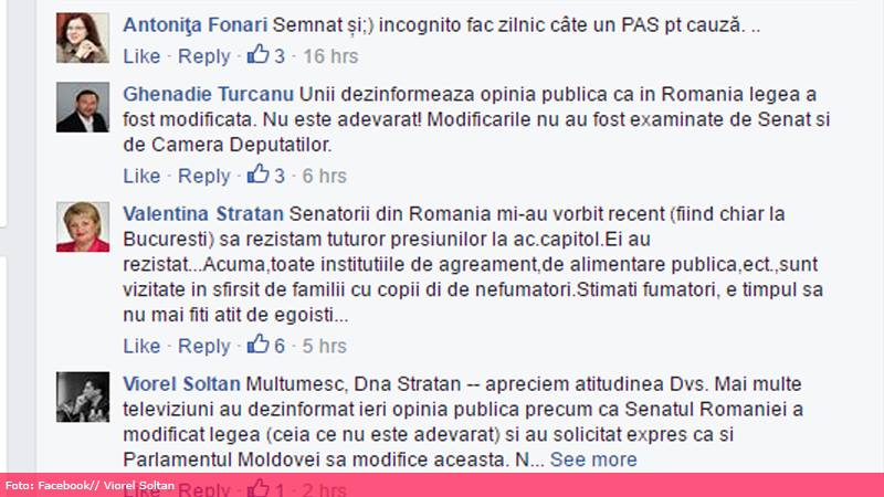 „Senatorii din România mi-au vorbit recent să rezistăm tuturor presiunilor la acest capitol. Ei au rezistat. Acum, toate instituțiile de agrement, alimentație publică, etc. sunt vizitate, în sfârșit, de familii cu copii de nefumători. Stimați fumători, e timpul să nu mai fiți atât de egoiști”, a declarat și Valentina Stratan, membru al Comisiei protecție socială, sănătate și familie din Parlament.