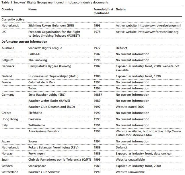 Astfel, după ce experții de la Universitatea din Oxford și de la Asociația Europeană de Sănătate Publică au studiat mai mult de 1.100 de documente și șapte site-uri web ale industriei tutunului, au constatat că începând cu anul 1979 industria tutunului a creat sau a planificat crearea organizaților menite să lupte „pentru drepturile fumătorilor” în cel puțin 26 de țări din întreaga lume. Printre acestea se numără Marea Britanie, Olanda, Franța, Australia, Grecia, Belgia, Venezuela, Danemarca, Finlanda, etc.
