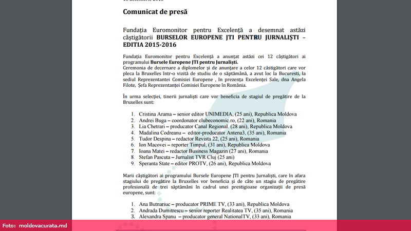 „În comunicatul de presă din 7 septembrie 2016, la care faceți referire în solicitarea dumneavoastră, este indicat un parteneriat între MAEIE, Fundația „Euromonitor pentru Excelență” din România și AO „Centrul Național de Comunicare” (CNC) din Republica Moldova, organizatorul local al programului. Singura mențiune a unei companii private, prezentă în comunicatul de presă vizat, a fost făcută în contextul unei incursiuni în istoricul acestui program lansat, încă în 1990, cu sprijinul Guvernului SUA, apoi relansat într-un format nou de Burse Europene pentru Jurnalişti, în 2007. Imediat după acest istoric, este indicată organizația responsabilă de implementarea programului în Republica Moldova - „Centrul Național de Comunicare”. Concomitent, ne exprimăm convingerea că toate aspectele cuprinse în program se înscriu perfect în câmpul legal al Republicii Moldova, fiind în strictă conformitate cu legislația în vigoare”, scrie în răspunsul remis de MAEIE.