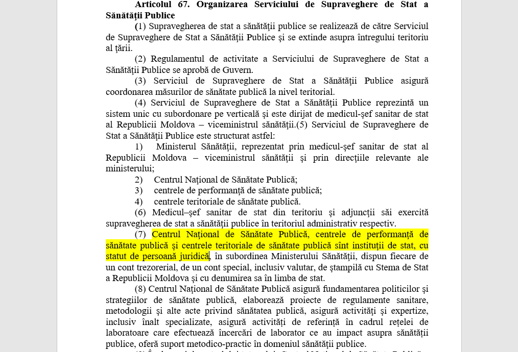 Mai mult, același articol prevede că Centrul Național de Sănătate Publică și centrele teritoriale sunt instituții de stat, cu statut de persoană juridică și fiecare dispune de un cont trezorerial, de un cont special, inclusiv valutar, de ştampilă cu Stema de Stat a Republicii Moldova şi cu denumirea în limba de stat.
