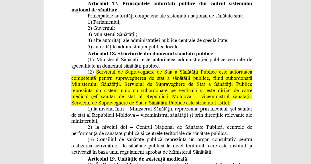 - Interzicerea viceministrului Sănătății să mai dețină funcția de medic șef sanitar de stat, întrucât intră în conflict cu legea. Acum, conform Legii privind supravegherea de stat a sănătăţii publice, Serviciul este condus de către Medicul șef sanitar de stat care, concomitent, este și viceministru al Sănătății, ceea ce contravine Legii privind administrația publică centrală, care prevede expres delimitarea funcțiilor de elaborare şi promovare a politicilor de cele de implementare a acestora.