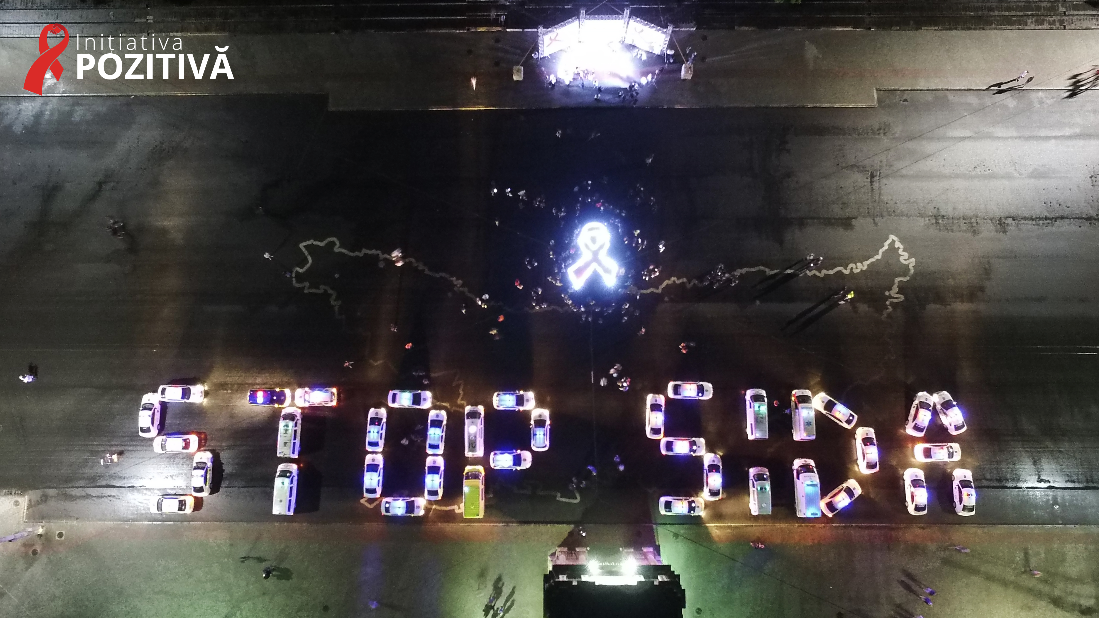 Câteva zeci de automobile cu girofare aprinse s-au aranjat formând inscripția „STOP SIDA!” în cadrul flashmob-ului „Să învingem SIDA împreună!”