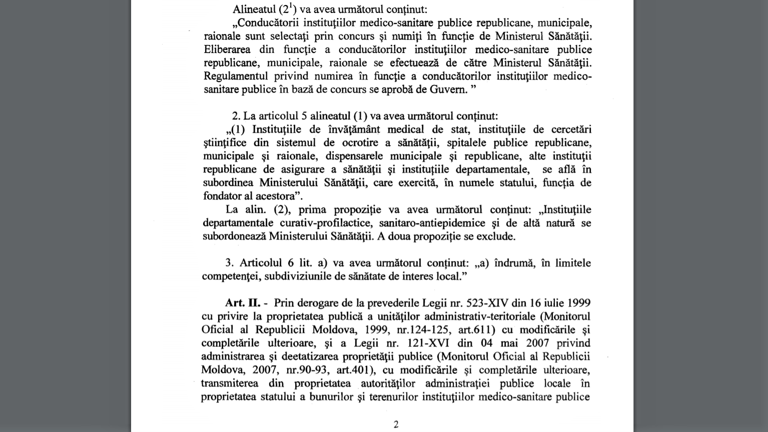 Potrivit documentului, Ministerul Sănătății urmează să devină unic fondator al tuturor spitalelor, excepție făcând doar instituțiile din asistența medicală primară și cele departamentale. Tot Ministerul ar urma să devină unic fondator și pentru viitorul Spital Universitar și întregul sistem de instruire medicală.
