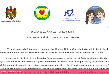 Școala de vară pentru voluntarii rețelei de Centre de Sănătate Prietenoase Tinerilor a fost organizată prin ordinul Ministerului Sănătății, cu suportul Agenției Elvețiene pentru Dezvoltare și Cooperare, în cadrul Proiectului moldo-elvețian ”generație sănătoasă – Servicii de Sănătate Prietenoase Tinerilor”, în parteneriat cu Biroul Regional UNESCO din Moscova, Proiectul REPEMOL, Corina Dascălu, nutriționist, scauți, și departamentul situații excepționale.