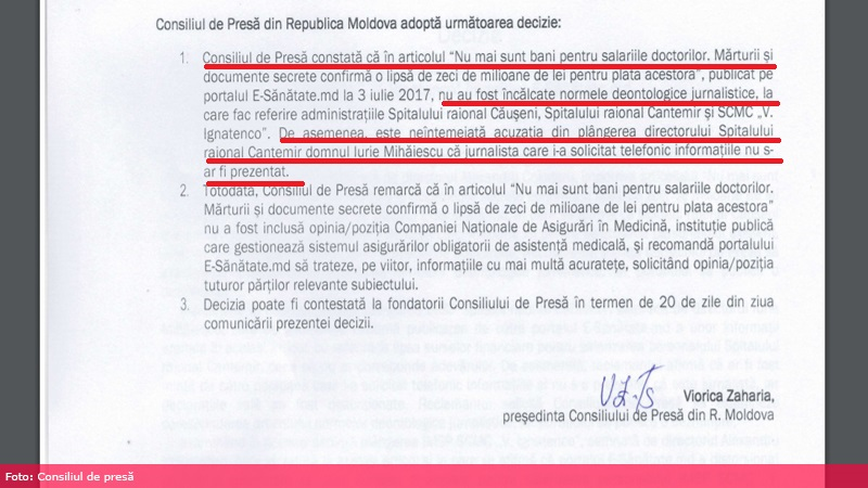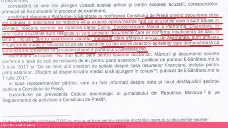 „Analizând răspunsul Platformei E-Sănătate la notificarea Consiliului de Presă privind depunerea celor trei plângeri și solicitarea ca redacția să-și expună opinia/poziția față de acuzațiile care îi sunt aduse în plângeri, răspuns semnat de doamna Elena Cioina, Coordonatoare Media a Platformei E-Sănătate, în care toate acuzațiile sunt respinse și sunt anexate documente care ar confirma insuficiența de bani în sistem, inclusiv pentru salarizarea cadrelor medicale către sfârșitul anului; de asemenea, sunt anexate înregistrările audio în varianta brută ale discuțiilor cu doi dintre directorii spitale care demonstrează că jurnalista s-a prezentat ca și colaboratoare a portalului E-Sănătate.MD…//Consiliul de Presă constată că în articolul „Nu mai sunt bani pentru salariile doctorilor. Mărturii și documente secrete confirmă o lipsă de zeci de milioane de lei pentru plata acestora", publicat pe portalul E-Sănătate.MD la 3 iulie 2017, nu au fost încălcate normele deontologice jurnalistice, la care fac referire administrațiile Spitalului raional Căușeni, Spitalului raional Cantemir și SCMC ,,V. lgnatenco". De asemenea, este neîntemeiată acuzația din plângerea directorului Spitalului raional Cantemir, domnul lurie Mihăiescu, că jurnalista care i-a solicitat telefonic informațiile nu s-ar fi prezentat”, scrie în răspunsul Consiliului de Presă.