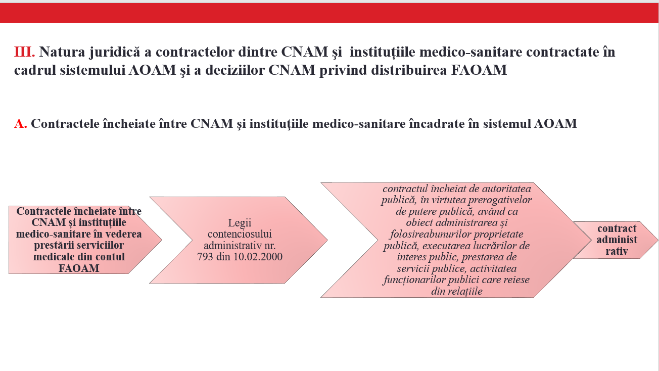 - Contractele dintre CNAM cu instituțiile medico-sanitare publice şi private, contractate în cadrul sistemului AOAM, care au ca obiect distribuirea, gestiunea, executarea mijloacelor bugetare, inclusiv cele din FAOAM, sunt contracte administrative.