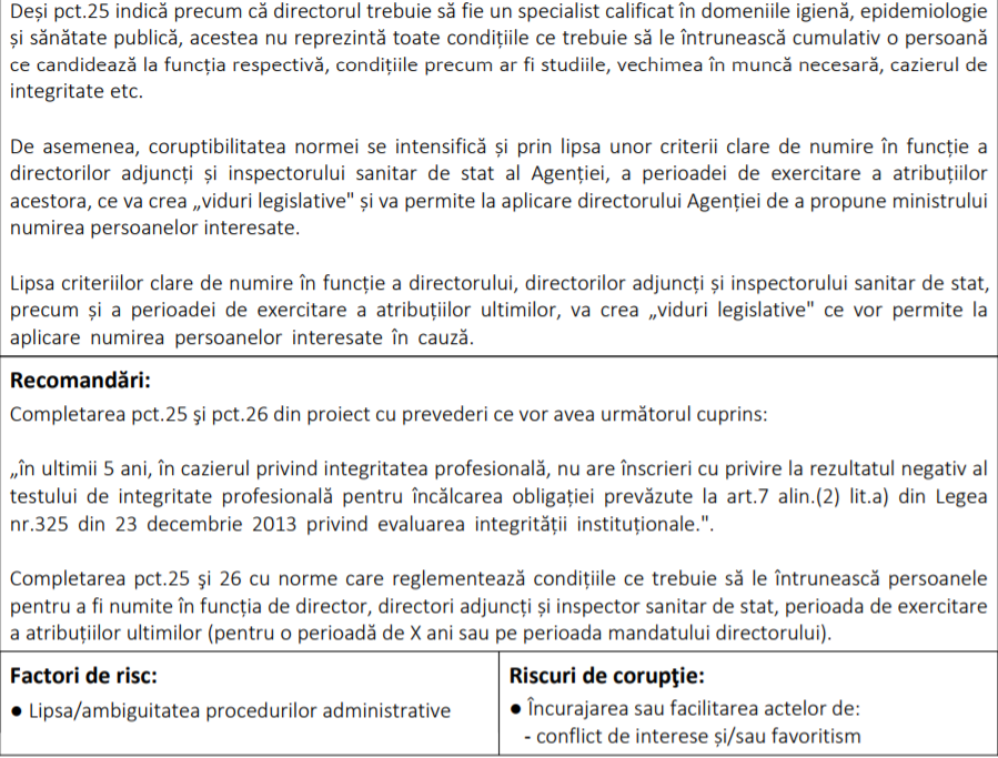 CNA vede o problemă și în faptul că directorii adjuncți și inspectorul sanitar de stat vor fi numiți prin ordin al ministrului, în lipsa unor criterii. „La aplicare Norma va permite directorului Agenției de a propune ministrului numirea persoanelor interesate. Lipsa criteriilor clare de numire în funcție a directorului, directorilor adjuncți și inspectorului sanitar de stat, precum și a perioadei de exercitare a atribuțiilor ultimilor, va crea viduri legislative ce vor permite la aplicare numirea persoanelor interesate în cauză. La aplicarea prevederilor coruptibile ale proiectului pot fi legalizate acte de abuz de serviciu și depășiri ale atribuțiilor de serviciu, precum și încurajate acte de conflict de interese şi/sau favoritism şi acte de corupţie activă/pasivă”, mai constată CNA.